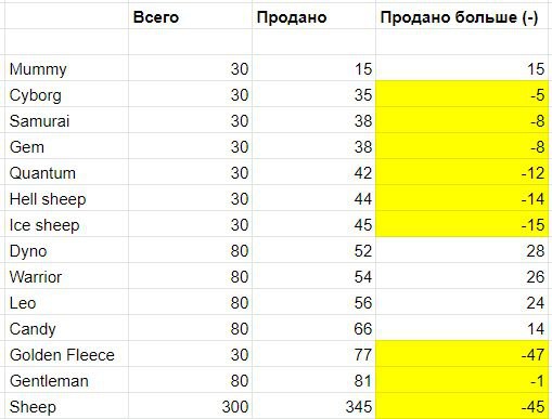 2. Мы готовы выкупать лишних овечек и удалять их. Относится к тем овечкам, которых выпустили больше чем планировали (отмечены в таблице желтым). Для этого нужно написать администраторам @secnol или @Andreyl95 до 24.05.2022 17:00 по Москве.