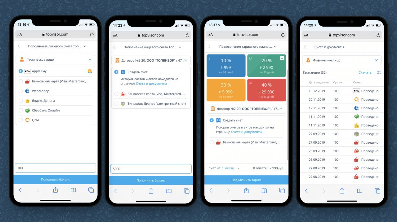 Также весь функционал Банка (пополнение баланса, подписка на тариф, редактирование реквизитов и так далее) адаптировался под мобильные устройства: телефоны и планшеты. На устройствах под управлением iOS (Apple) работает система мобильных платежей Apple Pay и совсем скоро на устройствах с операционной системой Android заработает Google Pay.