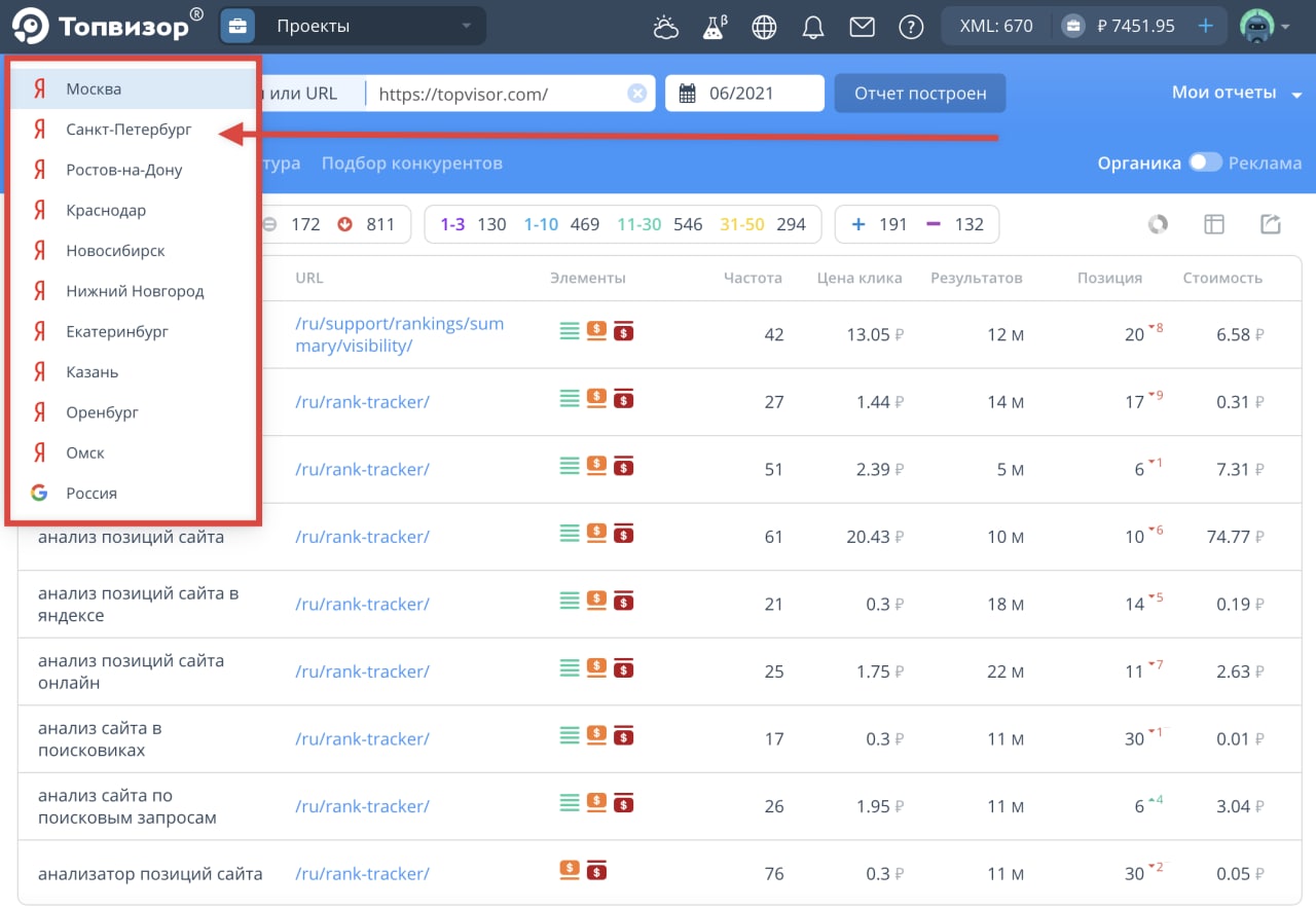 📍Смотреть сводку по всем подключенным регионам для всех проектов. В сводке указана средняя позиция и динамика по каждому региону.