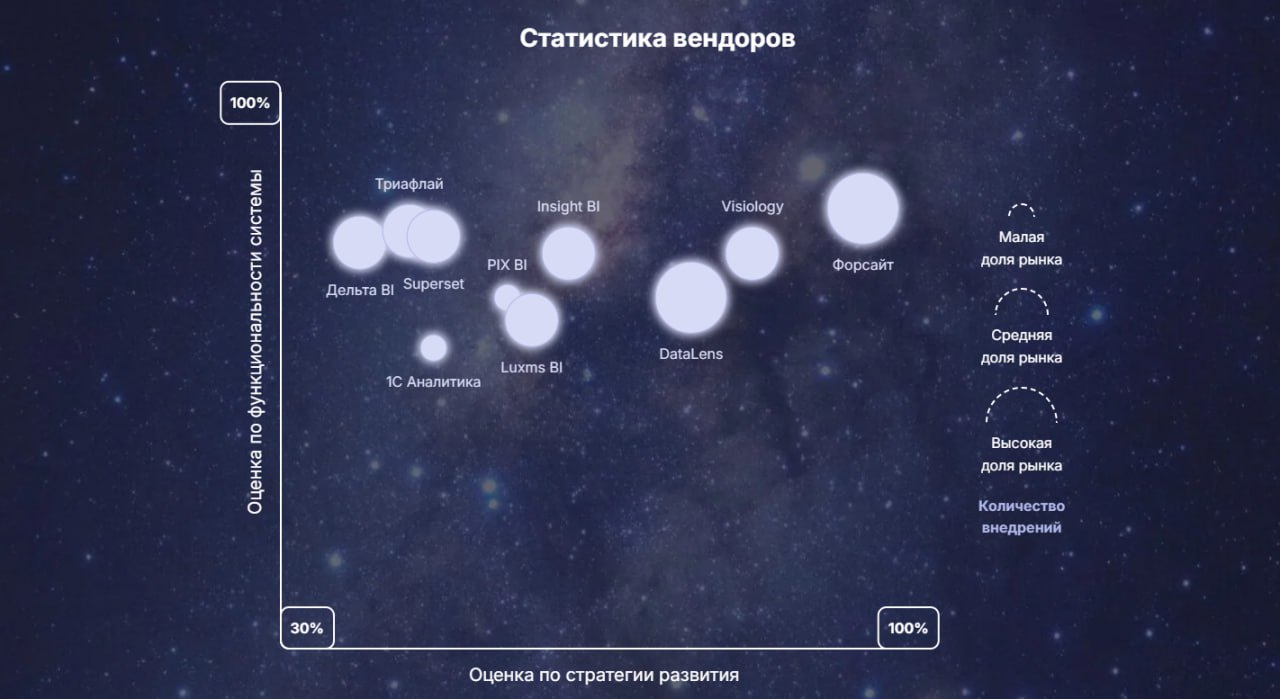 Исследование охватило 24 российских BI-решения, оцененных по 91 критерию.