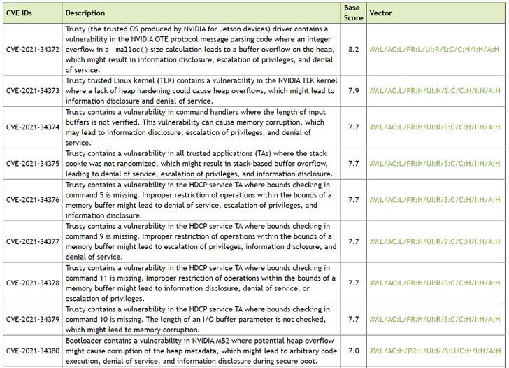 Компания NVIDIA, специализирующаяся на графических чипах, выпустила обновления программного обеспечения для устранения в общей сложности 26 уязвимостей CVE‑2021‑34372 до CVE‑2021‑34397 в серии Jetson system-on-module (SOM).