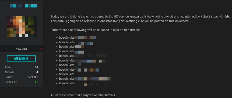 Группа компаний Robert Bosch GmbH попала под разрачу хакеров, которые скомпрометировали сервера Bosch iSite и выложили в сеть исходники для платформы 5G IoT.