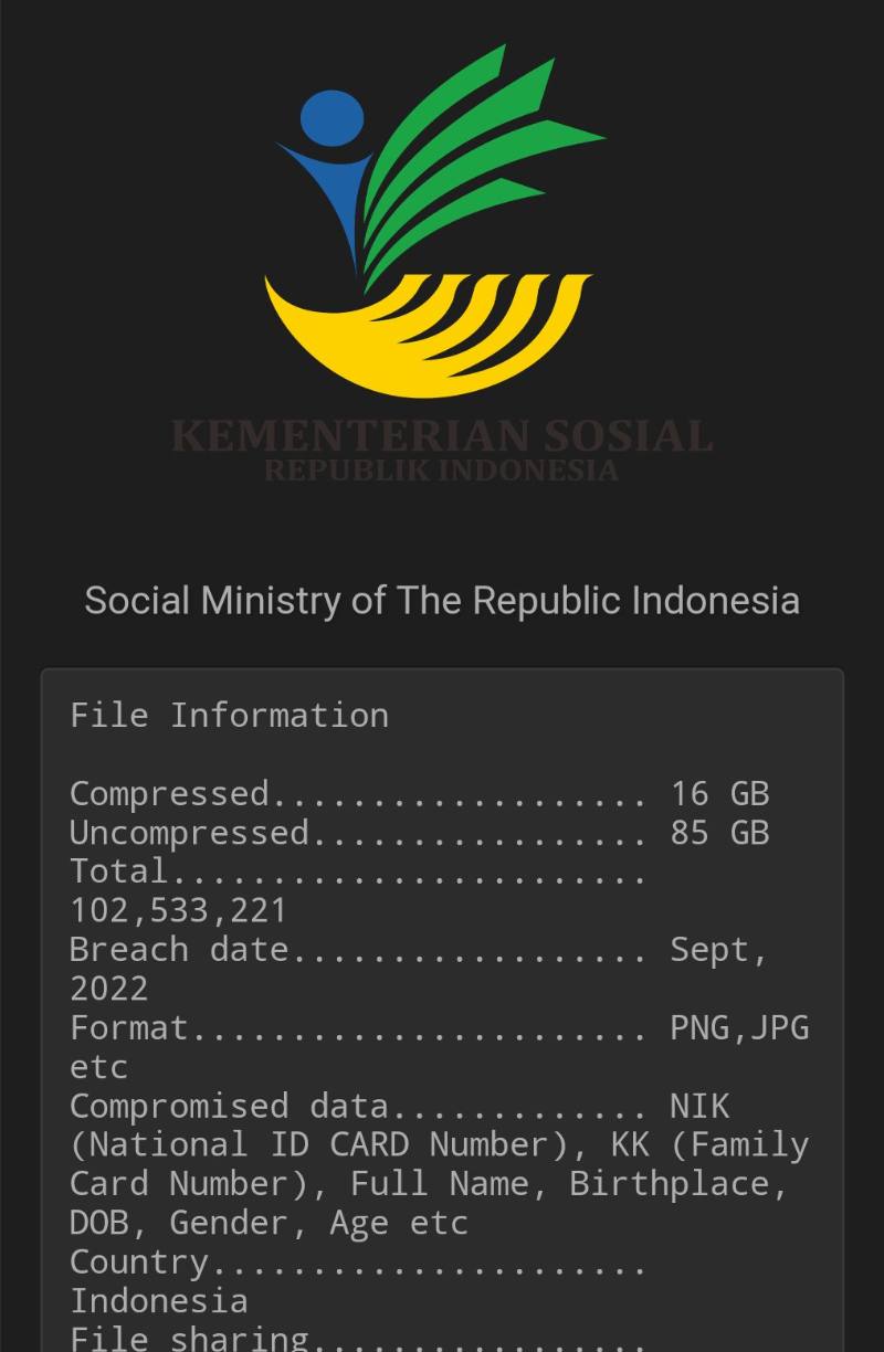 ͏Вслед за недавней утечкой персональных данных граждан Индонезии, в даркнет на реализацию выставлена другая база, якобы утекшая из Министерства социальных дел Индонезии с данными о гражданстве.