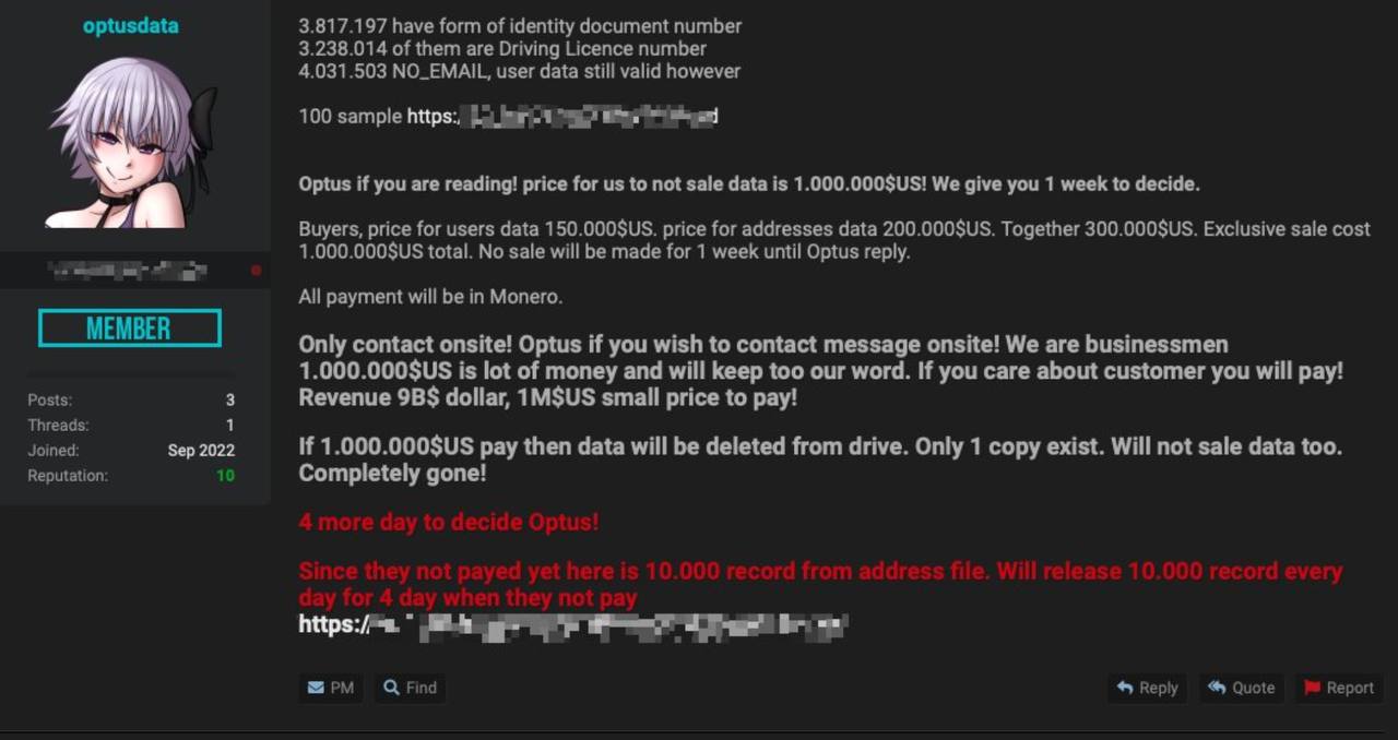 После дерзкой атаки на австралийского провайдера Optus и не менее дерзкого вымогательства 1 000 000 долларов США за украденную информацию на 11 млн. абонентов, актор принес извинения за утечку 10 тысяч клиентских данных и отозвал свои требования.