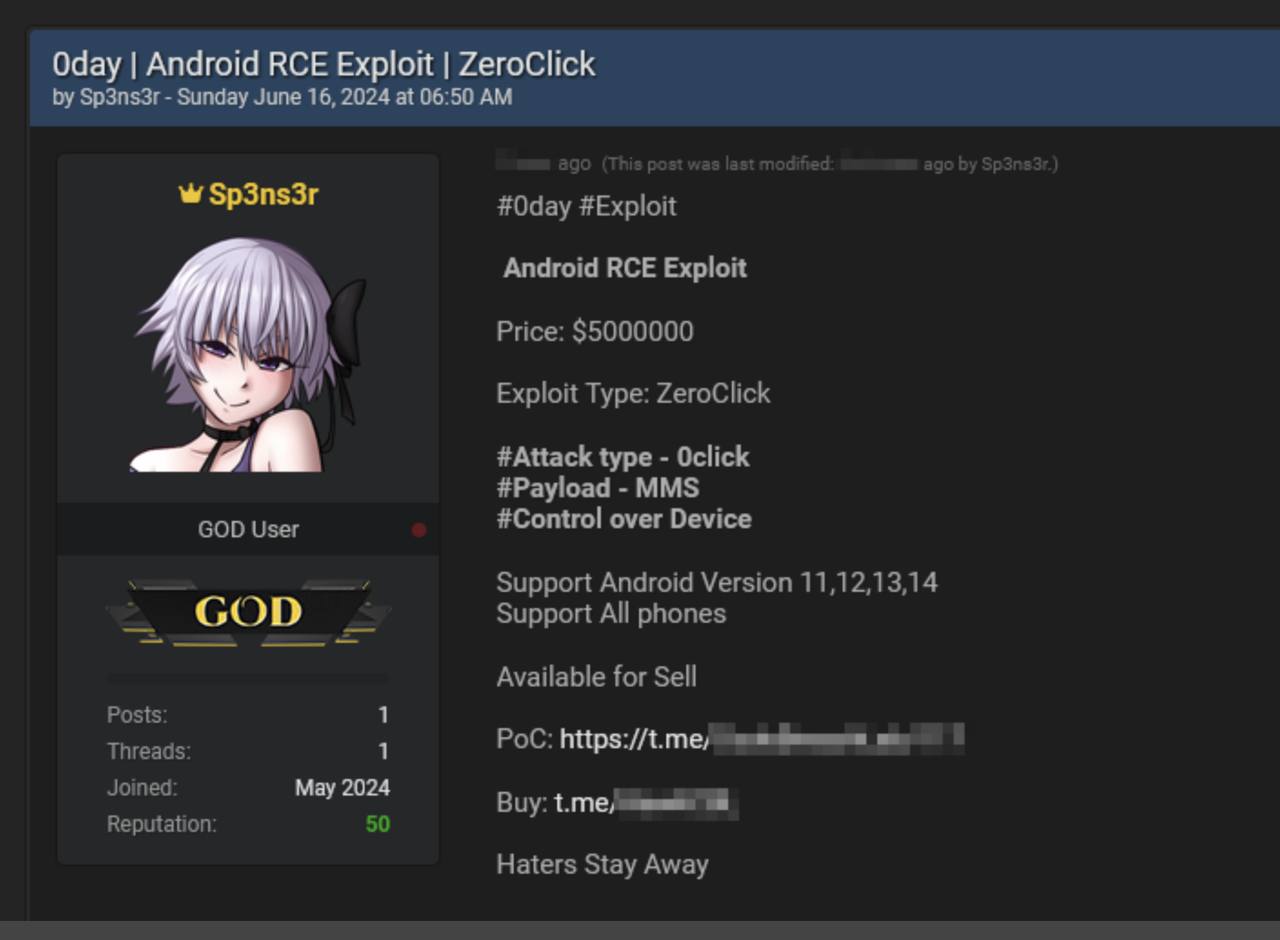 ͏Куда более солидный гонорар в киберподполье просит Sp3ns3r за Zero-click эксплойт под Android, который может быть реализован через MMS и открывает полный контроль над целевым устройством.