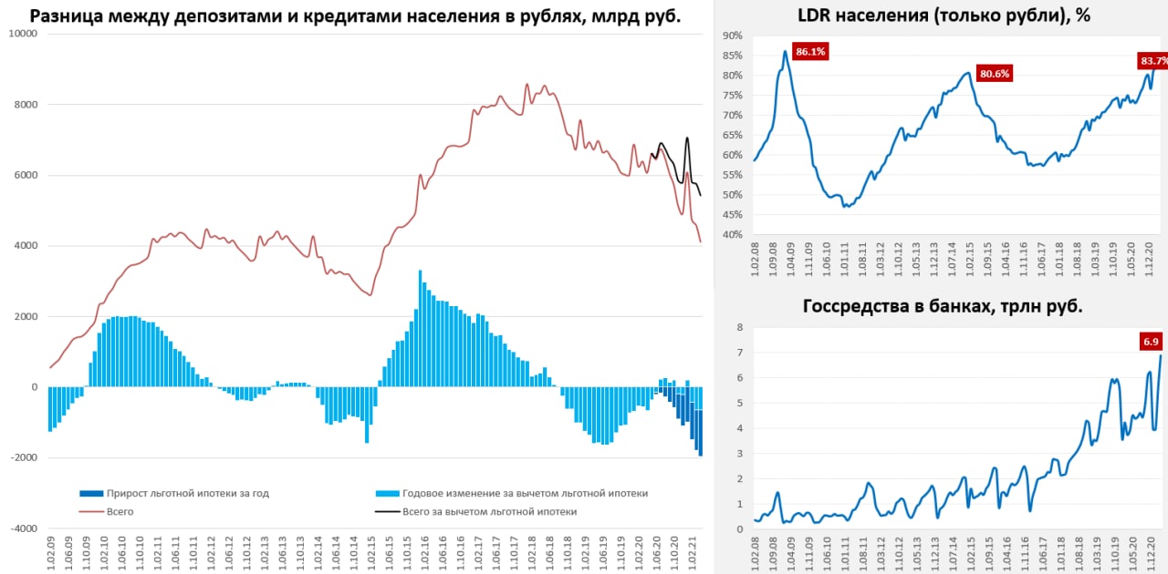 Какой из этого можно сделать вывод – ставки Банка России столь низкая, что у нас кредитный бум во всей красе и полное отсутствие склонности к рублевым сбережениям. Внешне, конечно так, но с нюансами… Из ~3 трлн руб. годового прироста кредитов населению ~1.3 трлн – это льготная ипотека, которая к процентной политике Банка России особого отношения не имеет. Без этой льготной истории ситуация выглядит немного иначе (на графике).