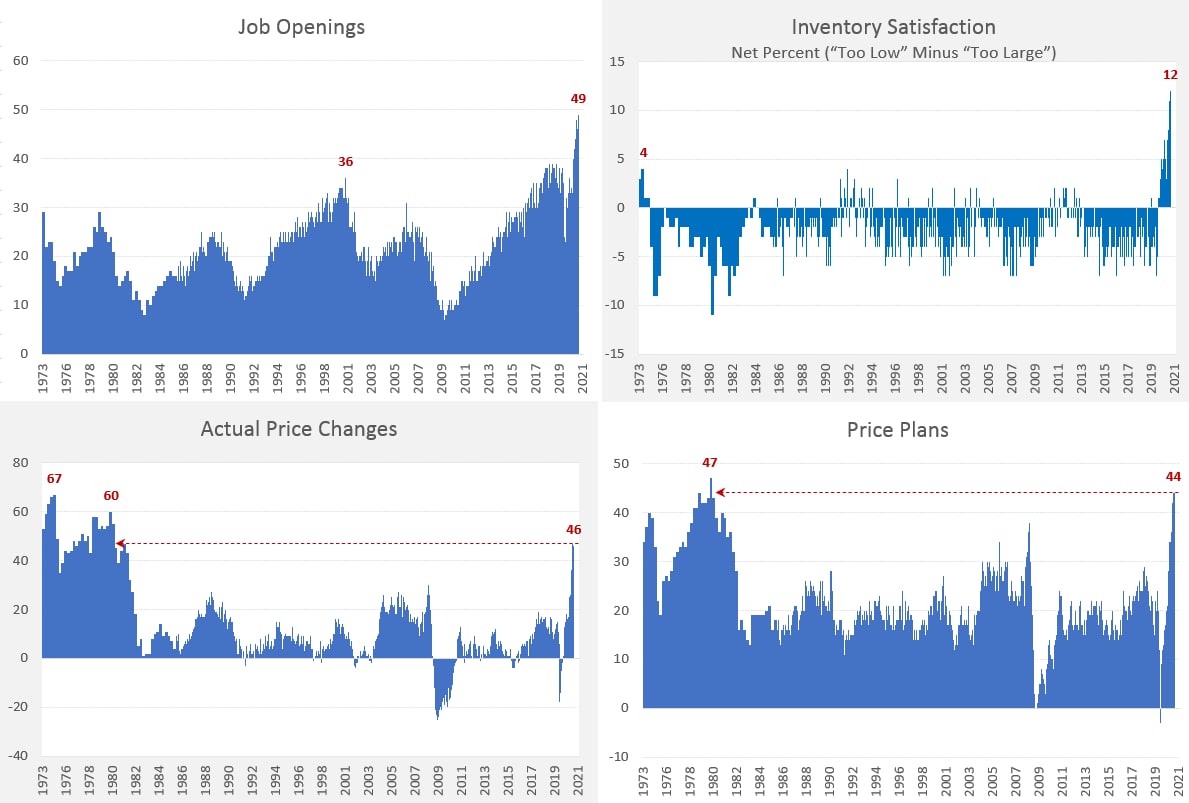 NFIB опубликовали данные по настроениям малого бизнеса в США – он тоже снизился. Сам индекс в реальности не так важен, но он дает определенное представление о происходящих процессах. Июльскую историю здесь можно описать примерно так: продажи растут более-менее, но издержки растут быстрее, потому с прибылью проблемы - падает… количество открытых вакансий рекордно за 48 лет, планы найма огромные, компенсации растут и будут расти, но нанять пока не получается … цены повышаем как 40 лет тому назад (индекс чуть ниже, чем в июне), а планируем повышать дальше рекордными темпами …