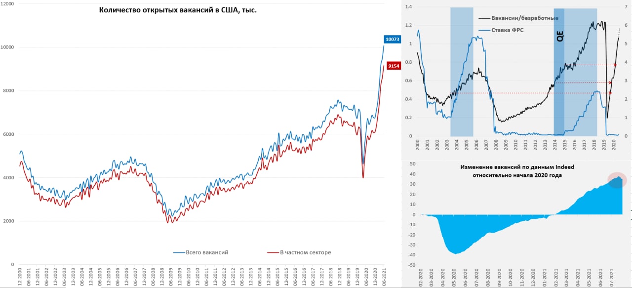 Если смотреть предыдущие циклы ужесточения политики ФРС – то ФРС начинала сворачивать стимулы и повышать ставки значительно раньше, чем это делается сейчас. А текущее соотношение вакансий и безработных уже соответствовало скорее завершению цикла повышения ставок. Очевидно, что сейчас они сильно отстают, потому как вопрос сворачивания еще только начинает обсуждаться.
