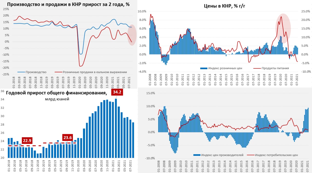 В августе, на фоне ограничений и давления со стороны властей на компании, китайская экономика продемонстрировала стремительное продолжение замедления. Рост промышленного производства замедлился до 5.3% г/г, но здесь есть поддержка со стороны экспорта, относительно 2019 года производство растет на 11.2%, что соответствует докризисной динамике (спасибо стимулам в развитых странах).
