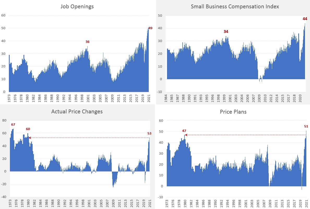 В октябре рекордное c 1980 года количество опрошенных предприятий заявило о текущем повышении своих цен (индекс достиг 53), при этом ценовые планы компаний оказались самыми агрессивными за всю историю существования индекса с 1973 года (51). По открытым вакансиям октябрь был чуть ниже сентябрьского максимума, но по компенсациям работникам рекордное количество компаний заявляет об их повышении сейчас и планах их дальнейшего повышения. В целом малый бизнес заявляет о том, что ситуация с наймом немного улучшилась, агрессивно повышая зарплаты и цены. Это уже не так уж временно ...
