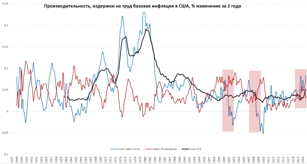Чуть ранее данные по производительности труда показали, что в 3 квартале производительность падала максимальным за 40 лет темпом -5% q/q SAAR, а удельные расходы на рабочую силу росли темпом в 8.3% q/q SAAR. И это очень важный нюанс, отличающий текущую ситуацию от кризисов 2000 и 2008 годов, потому как тогда на выходе из кризиса росла производительность/падали издержки на труд, а сейчас мы видим диаметрально-противоположную картину. И это фактор в пользу того, что инфляция далеко не такая временная как кому-то кажется.