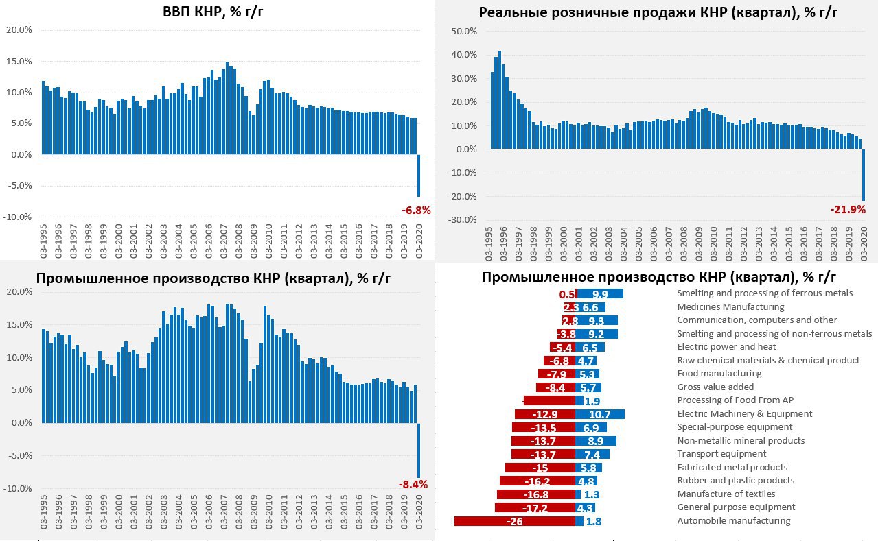 Экономика в целом: ВВП Китая сократился на 9.8% относительно предыдущего квартала и на 6.8% относительно первого квартала прошлого года. Здесь нужно учитывать, что до этого он рос на 6% в год. В целом за 1 квартал экономика потеряла 2.8% годового ВВП – это несколько хуже ожидаемого (если кто помнит месяц назад мы оценивали потери ~ 2.5%), розница и экспорт здесь выглядят слабее. Но в целом все в рамках ожидаемого сокращения.