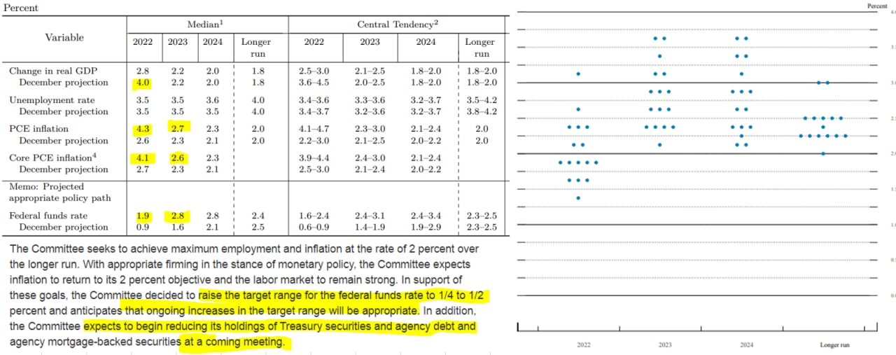 ✔️ Несмотря на повышение прогноза ФРС не ждет, что сможет вернуть инфляцию к цели в текущем году и повысила прогноз до 4.3% в 2022 году и 2.7% в 2023 году;