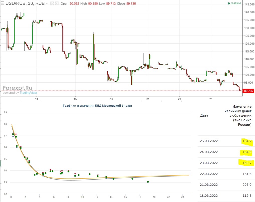 Возврат наличных потихоньку затухает, за последние пару дней в систему вернулся еще 171 млрд, на данный момент вернулось более 2/3, или 1.93 трлн руб., постепенно процесс таких полетов будет завершаться. Структурный дефицит ликвидности практически обнулился, рухнув до всего 76 млрд руб., здесь большую роль сыграли факторы обязательных резервов и значительные выплаты из бюджета. Но это внутри, на оффшоре, похоже, в рублями опять стало хуже, т.к. ставки там опять под 40-50% годовых, а спред между внутренним и офшорным курсом опять перевернулся, доллар теперь там стоит меньше 82 руб./долл., а Мосбиржа выше 83 руб./долл. Спрос на рубли в оффшоре явно подрос ... а ликвидности нет.