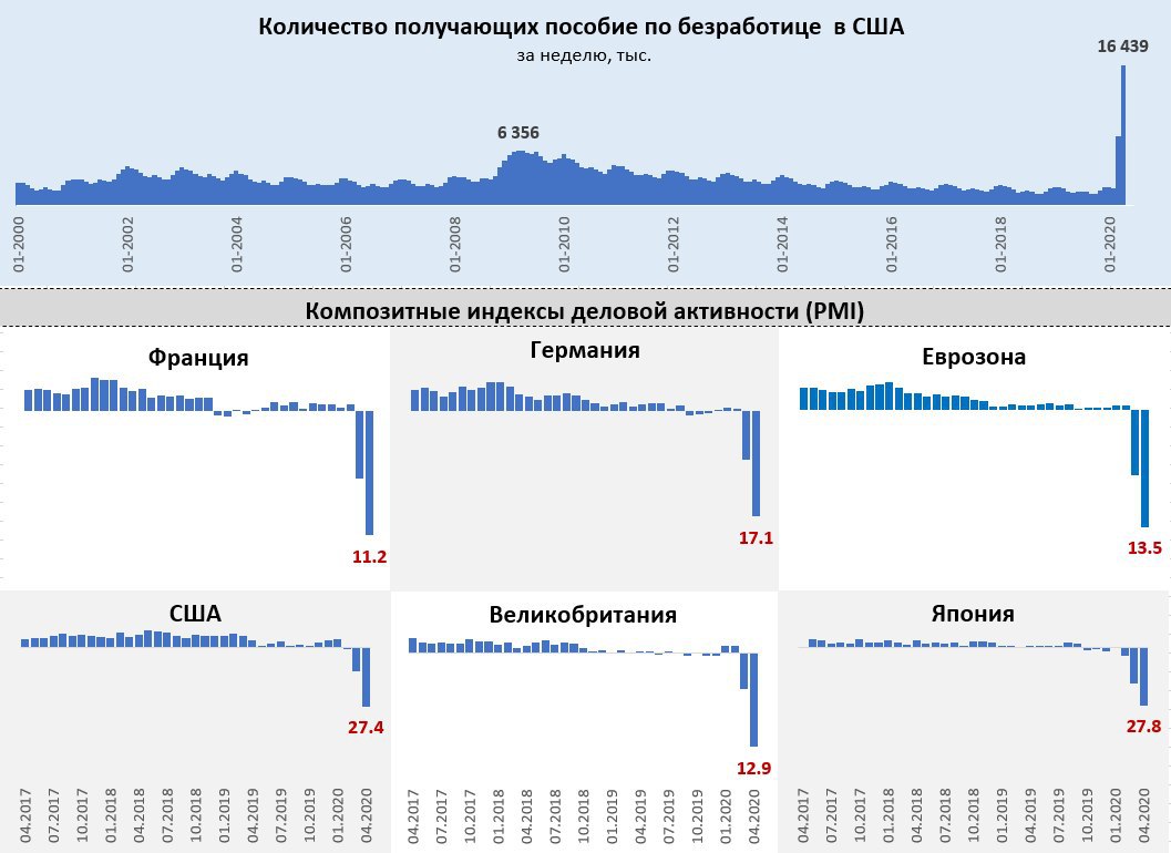 Доп.: Вышли данные по продажам новых домов в США – здесь в марте все еще было не так плохо и падение за месяц составило всего 15.4% (бывало и больше, но это март). Апрельские данные по деловой активности пока предварительные и крайне печальные - экономика стоит, т.к. данные за апрель – то уже учитывают значительную часть потерь от карантина и потери эти огромны. Полный провал во Франции, очень плохо обстоят дела Великобритании, чуть лучше в Германии и относительно неплохо в США и Японии (когда-то это неплохо называлось «ужас…ужас»).