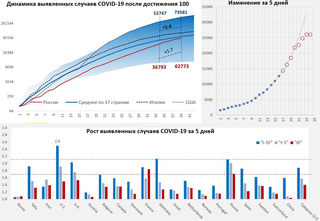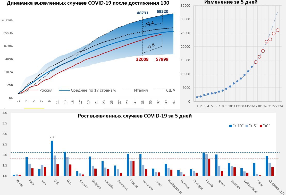 За 5 дней количество выявленных случаев увеличилось в 1.5 раза, в среднем рост в этой фазе составлял 1.3 раза за 5 дней. Учитывая тот факт, что ежедневные данные они не очень надежны, а прирост за 5-тидневный период несколько скомпрометирован аномальными изменениями – то пока наблюдаем, в среду увидим 100 тыс.
