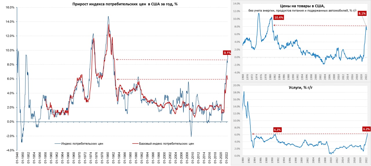 С инфляцией в США все оказалось сильно хуже даже достаточно скептичных ожиданий. Прирост потребительских цен в июне составил 1.3% м/м – самый сильный месячный прирост с 2005 года, но тогда был один месяц такой, сейчас уже много месяцев высокой инфляции. Годовой прирост цен составил 9.1% г/г – рекорд с ноября 1981 года. Активно дорожали продукты питания 1.0% м/м и 10.4% г/г, но основной рывок цен, конечно, обеспечил взлет цен на бензин, в результате цены на энергию прибавили 7.5% м/м и 41.6% г/г.