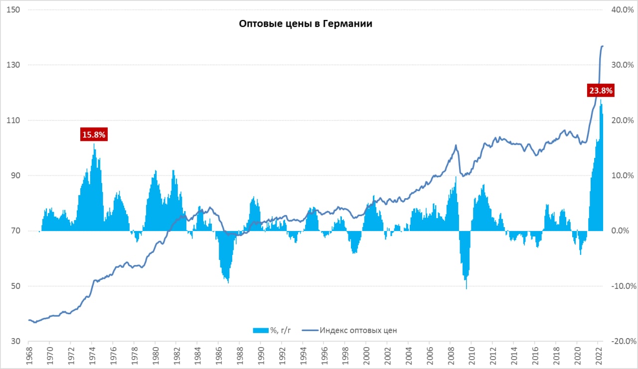 Оптовые цены в Германии наконец притормозили свой безумный забег и выросли в июне только на 0.1% м/м, годовой прирост цен замедлился до 21.2%. Внутренняя динамика цен пока разнонаправленна: по большинству категорий конечной продукции рост цен продолжал уверенно ускоряться, промежуточная продукция (в т.ч. с/х производства и металлургии), наоборот по ряду позиций дешевела. Это указывает в пользу того, что пока конечные цены для потребителя продолжат расти достаточно быстро, но с шансами на передышку позднее.
