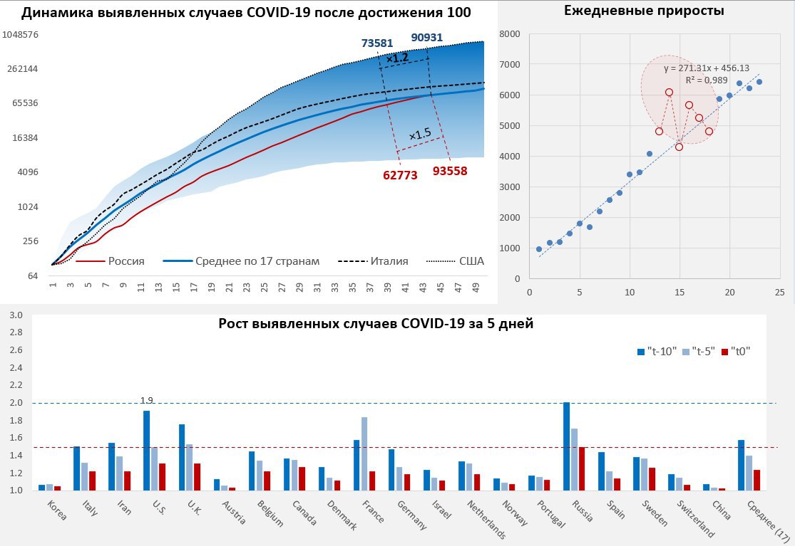 Количество выявленных случаев заболевания COVID-19 в России выросло за последний день на 5841, общее количество случаев - 99.3 тыс. Дневной прирост упал ниже 6 тыс. впервые за последние дни, произошло это исключительно за счет Москвы, где резко сократилось количество новых случаев (2.2 тыс. против 3.1 тыс. во вторник) – достаточно странное сокращение сразу в 1.5 раза. Остальная страна продолжила устойчиво расти, да и для Москвы текущие данные выглядят опять аномально.