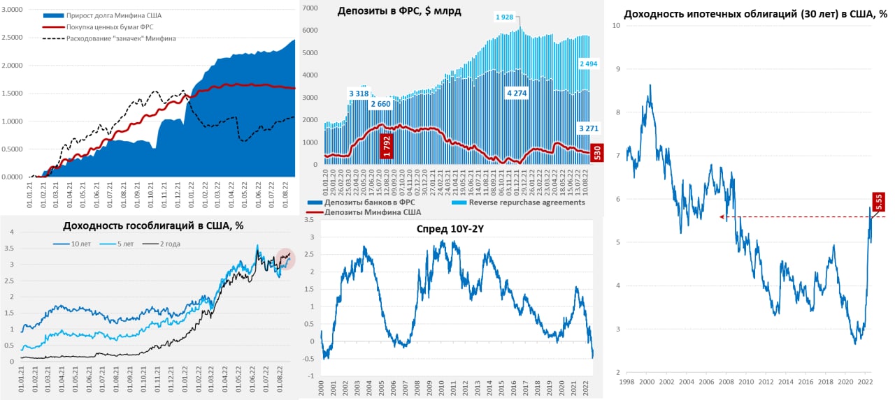 Если исходить из формальных целей ФРС и Минфина США – то до конца квартала ФРС должна бы сократить портфель на ~$180 млрд, а Минфин США забрать с рынка $120 млрд на свои счета, т.е. до $300 млрд за месяц с небольшим должно уйти из банков, а чистое предложение годолга должно подрасти в сопоставимых объемах. Но если они это сделают рынкам будет больно, причем Йеллен возможно свой план реализует, а вот в Пауэлла верится все меньше... но посмотрим, что он скажет в пятницу в Джексон Хоул, будет ли это очередной сеанс психотерапии (что скорее всего), или все же глава ФРС решится на что-то более нестандартное... тем более, что рецессия уже здесь, а инфляция остается высокой.