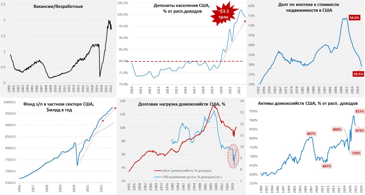 3️⃣ Низкая долговая нагрузка: долг домохозяйств подрастает – американцы начали использовать кредит. Долг относительно располагаемых доходов вырос до 101%, стоимость обслуживания долга выросла до докризисных уровней 9.6% от доходов. Этот фактор заработал, прирост долга за год составил $1.26 трлн, или 7% г/г. Но резкое повышение ставок ФРС и взлет ипотечных ставок, очевидно, притормаживает рост долга. Основной долг в США – это ипотека и при ставках 6-7% рост здесь явно ограничен. На этом фоне объем ипотеки упал до 29.5% от стоимости жилья в США и находится на минимумах с 1980-х. Хотя потенциал кредита еще достаточно большой, т.к. расходы на обслуживание долга остаются все еще на исторически низких уровнях.