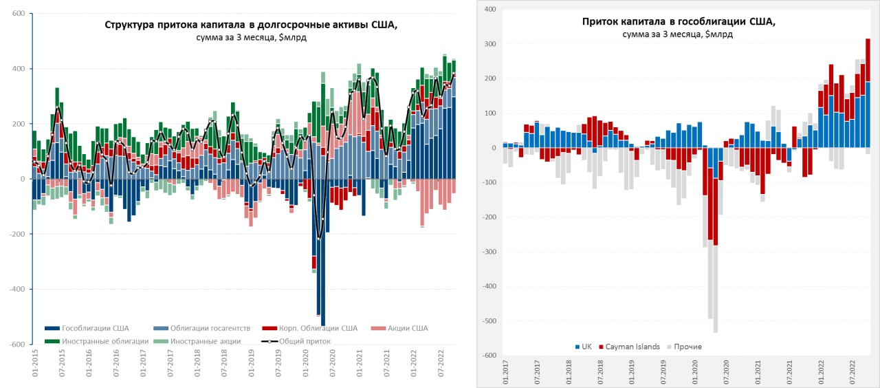 Покупателем госдолга уже традиционно для последнего времени стали Лондон (+$47 млрд за месяц и +$191 млрд за 3 месяца) и карибские офшоры, а именно Кайманы (+$42 млрд за месяц и +$126 млрд за 3 месяца). Но ключевой вопрос «откуда?» все же остается открытым, приток в гособлигации США не пришел из Азии (там скорее отток даже с учетом Ближнего Востока), он не пришел из еврозоны (ЕЦБ, наоборот, зафиксировал приток портфельных инвестиций в регион на фоне дефицита текущего счета). Он пришел из огромной серой оффшорной зоны ... в которой мало кто понимает, что происходит.