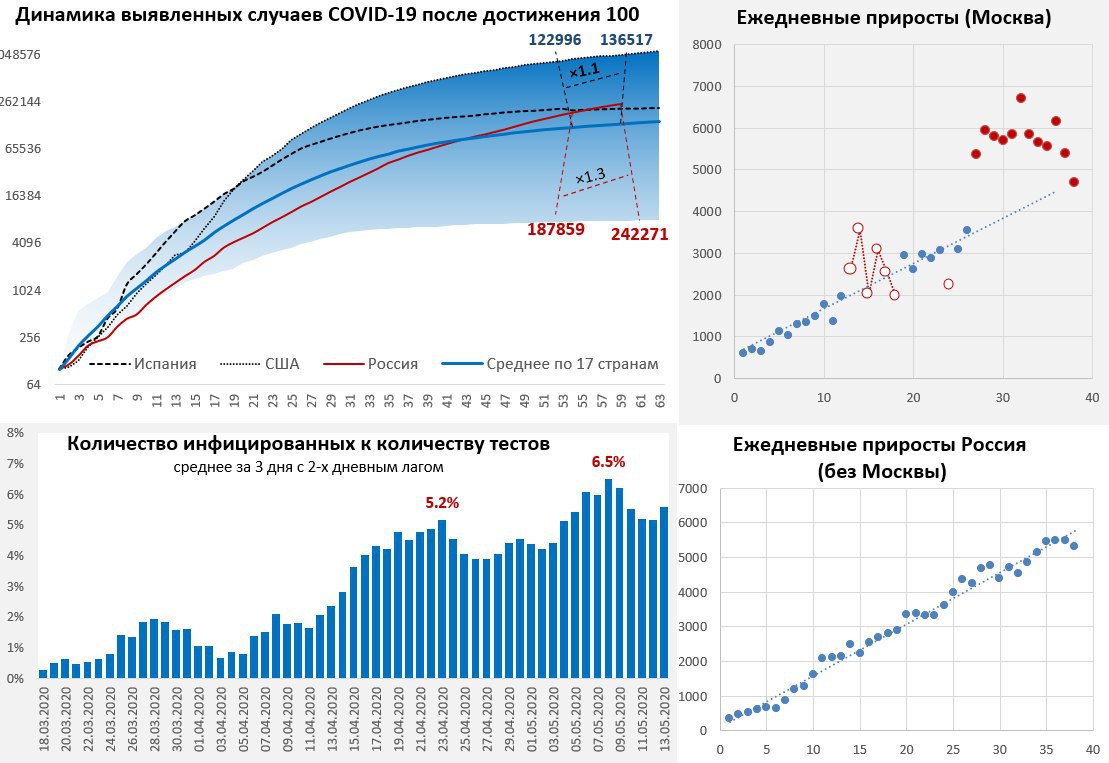 После резкого скачка в начале мая прирост выявленных случаев COVID-19 в России продолжает замедляться, дневной прирост снова упал ниже 10 тыс., до 9200 человек. Общее количество случаев достигло 272.0 тыс. Сокращение произошло в основном за счет Москвы, где количество выявленных случаев рухнуло до 3505 – очередная московская аномалия. Возможно, опять какие-то изменения в тестировании, остается только догадываться. Без Москвы динамика по России остается относительно стабильной – прирост относительно стабилен. Ситуация в целом стабилизируется, но возможны очередные сюрпризы.
