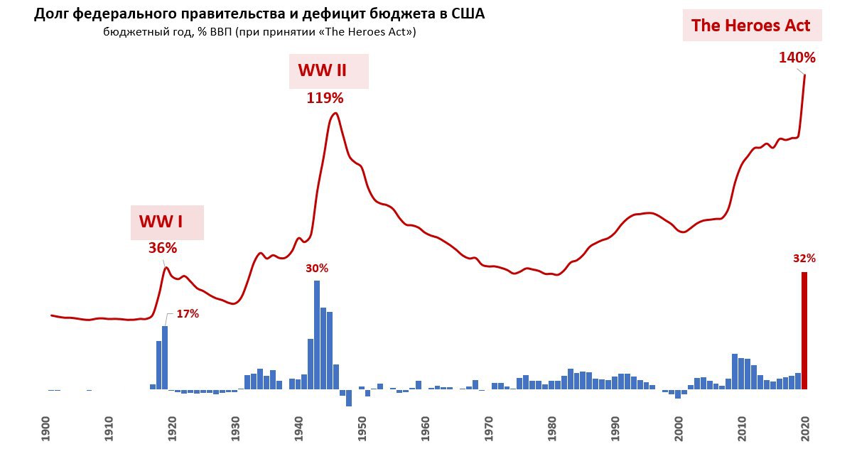 Принятие «The Heroes Act», возможно, стоит воспринимать как ту самую красную черту, которая ознаменует окончательный консенсус ослов и слонов в инструментарии (но, конечно не целях – здесь они зачастую диаметрально противоположны). Если пакет утвердят, то дефицит бюджета превысит уровни 1943 года, а долг уровни 1947 года.