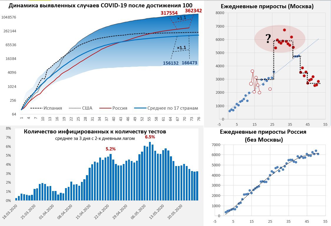Прирост выявленных случаев COVID-19 в России оказался минимальным с 1 мая, за последний день количество выявленных случаев составило 8599 человека, но в целом все остается в рамках сложившихся тенденций. Общее количество случаев достигло 344.5 тыс. Количество новых случаев в Москве упало до 2516 новых случаев в день. Количество тестов в последние дни около 280 тыс. в день, количество новых случаев к количеству проведенных тестов продолжает снижаться. Без Москвы динамика по России тенденции особо не меняются, пока развитие идет в рамках умеренной восходящей тенденции.