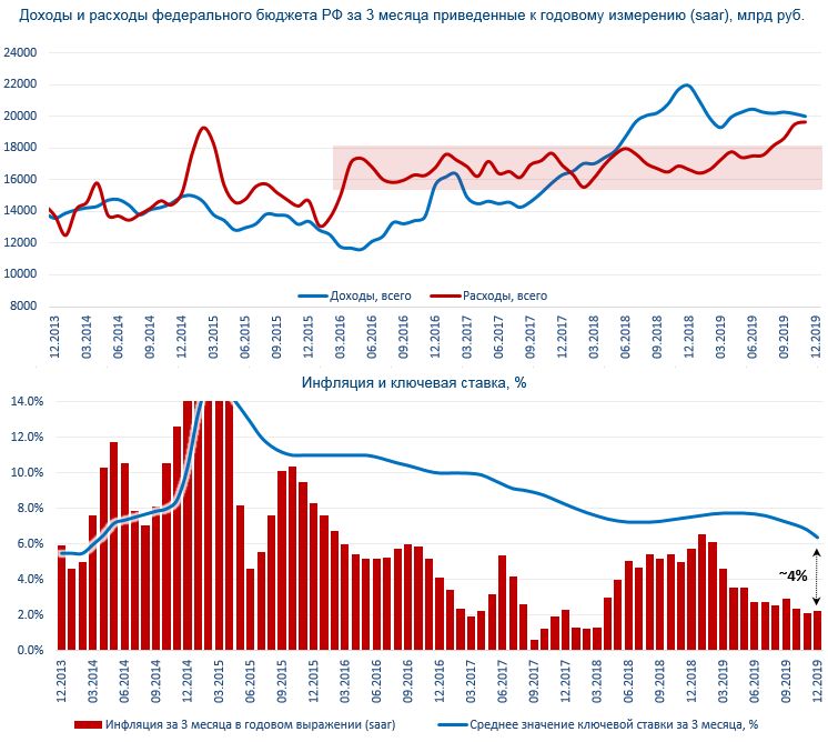Инфляция (дек./дек.): 2017 год = 2.5%; 2018 год = 4.3% (разовый фактор ослабление рубля ~1.5 п.п за вычетом которого инфляция была ниже 3%); 2019 год = 3% (разовый фактор – повышение НДС, вклад которого Банк России оценил в 0.6-0.7 п.п). Это позволяет говорить о том, что последние три года у нас устойчивый уровень инфляции – это 2.5-3% (что не удивительно при жестком бюджете, жесткой ДКП, отрицательной демографии)