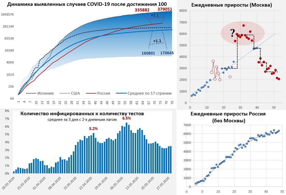 Прирост выявленных случаев COVID-19 в продолжает оставаться в рамках сложившихся тенденций, за последний день он упал до 8338 человека. Общее количество случаев достигло 370.8 тыс. Количество новых случаев в Москве упало до минимального уровня за 5 недель и составило 2140 человек. Количество выздоровевших составило рекордные 11 тыс., количество активных случаев продолжает сокращаться. Без Москвы динамика по России указывает на торможение, в последнюю неделю ежедневный прирост новых случаев практически неизменен и находится чуть выше 6 тыс.