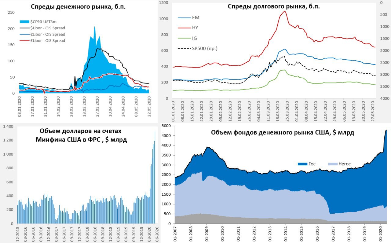 На неделе ФРС продолжила наращивать баланс, но достаточно медленно – к 27 мая активы выросли до $7097 млрд, или всего на $60 млрд за неделю. Главный фактор роста – это запуск программ скупки корпоративных бумаг (+$33 млрд) и коммерческих векселей (+$8.5 млрд), на этом фоне корпоративные спреды поползли вниз (больше всего, конечно по «мусорным» бумагам), а спред между коммерческими векселями (Commercial Paper) и векселями Казначейства упал ниже 10 б.п.
