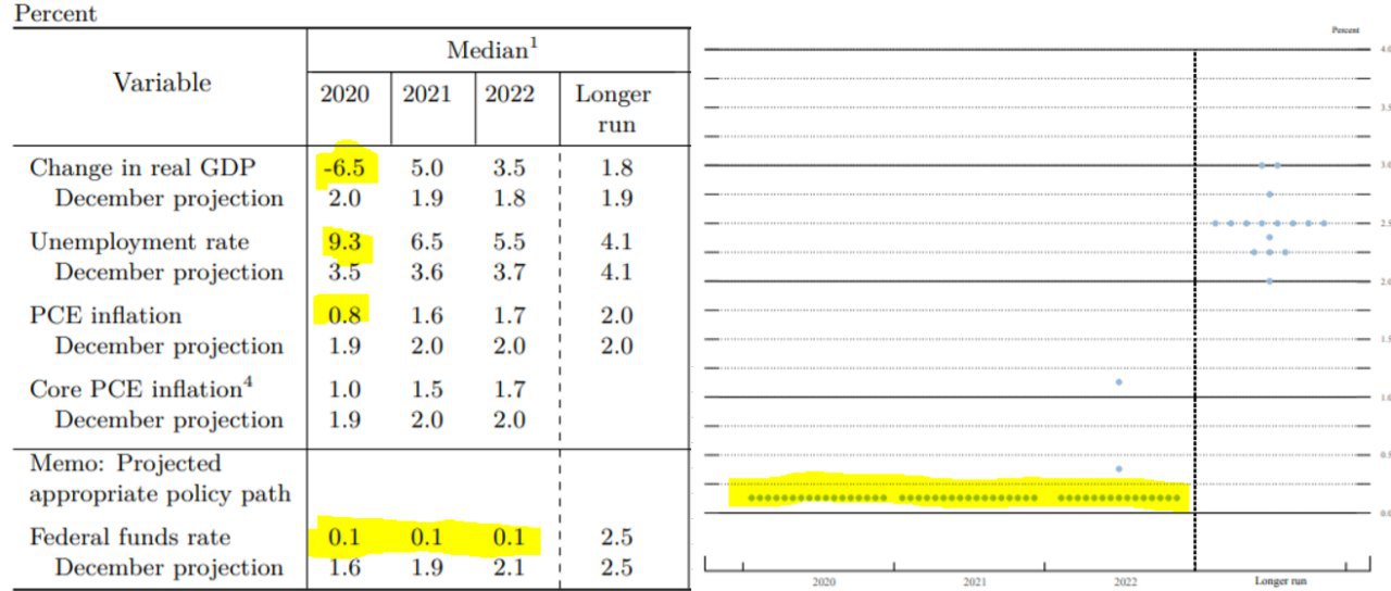 В текущем году ФРС ожидает -6.5% по ВВП и не планирует изменения ставок до 2022 года включительно.