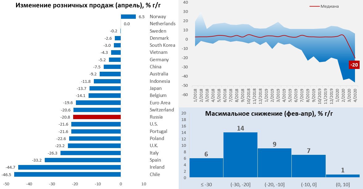 Многие страны уже отчитались по рознице за апрель, интересно посмотреть в целом на ситуацию. В общем-то в основном падение было в диапазоне 20-30%. Мы в общеевропейском диапазоне, Китай к апрелю восстановил 2/3 потерь. Несколько удивили Норвегия и Нидерланды …