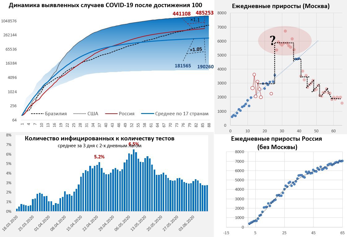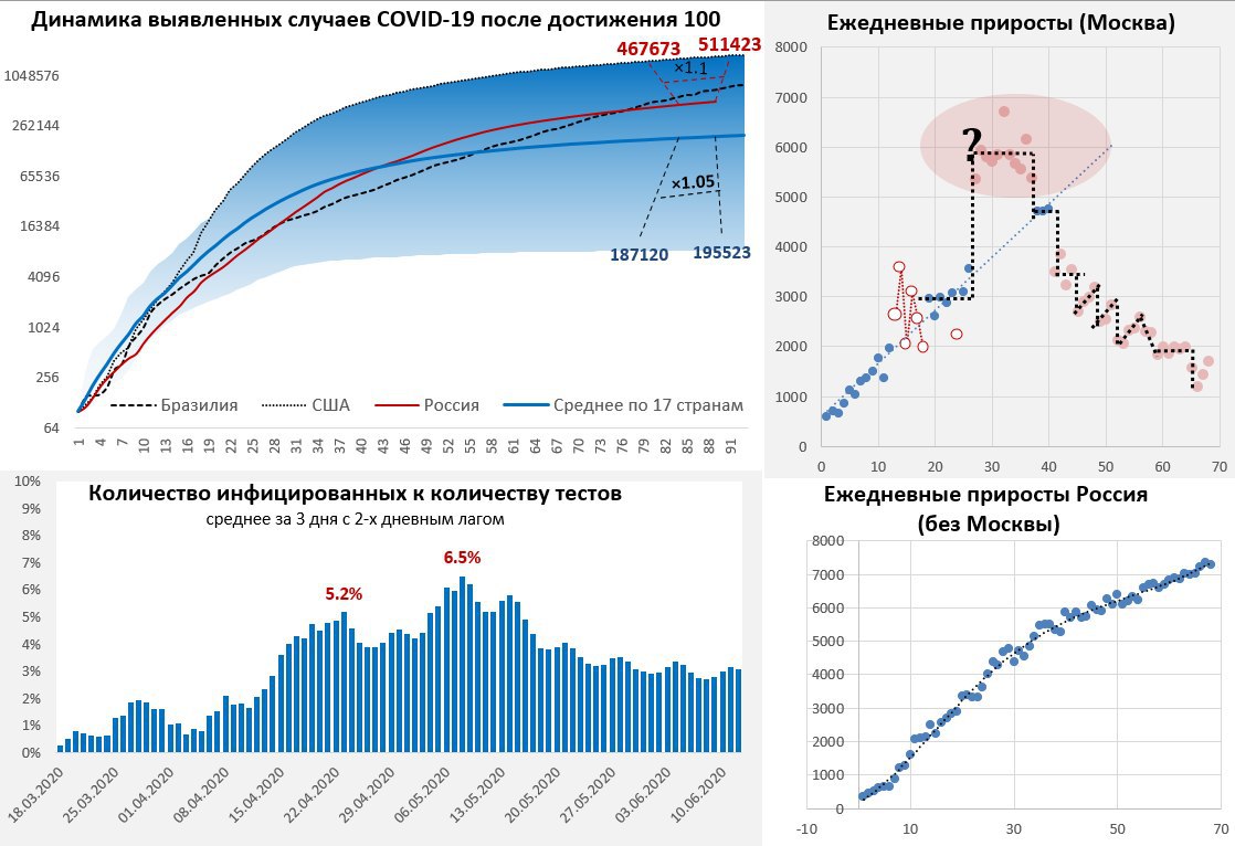 По России без Москвы количество новых случаев составило 6.8 тыс. в день. Замедление роста в последние три дня, видимо, связано с сокращением тестирования в праздничные и выходные дни, потому не стоит удивляться, если количество случаев в ближайшие дни подрастет.