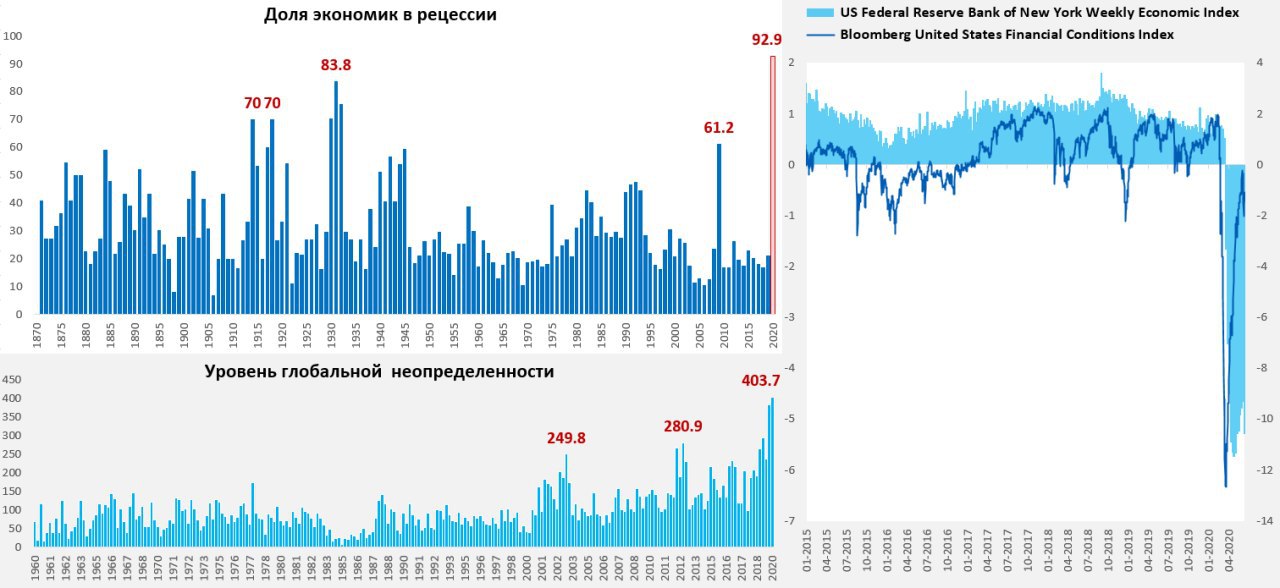 Пара графиков из последнего обзора Всемирного банка. В 2020 году ожидается, что почти 93% экономик мира столкнутся с рецессией, что станет максимальным уровнем за последние 150 лет наблюдений. Уровень глобальной неопределенности достиг максимальных значений за послевоенную историю. Индекс экономической активности указывает на глубокий спад в экономике, но в финансовом секторе все уже почти хорошо благодаря безумной накачке ликвидности и фискальным мерам …