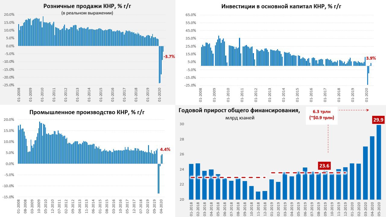 Китай сегодня опубликовал основной пакет данных за май, промышленное производство прибавило 4.4% относительно мая 2019 года (немногим лучше данных апреля 3.9%), оно восстановилось достаточно быстро, но темпы роста пока так и не вернулись к докризисным (5.5-6% г/г). Наихудшая динамика все еще в секторах одежды (-19.6% г/г) и производства мобильных телефонов (-9% г/г), зато производство авто +19 % г/г и вообще с машиностроением все неплохо – рост на 15-20% г/г.