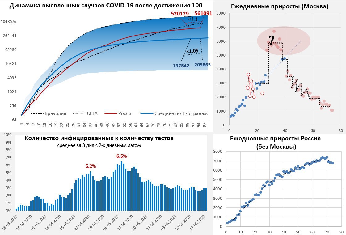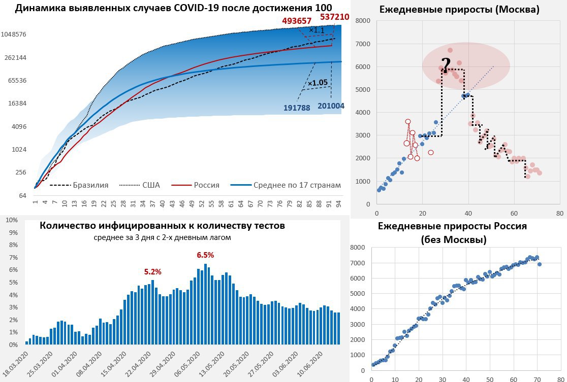 По России без Москвы количество новых случаев составило 6.8 тыс. в день. Замедление роста в последние три дня, видимо, связано с сокращением тестирования в праздничные и выходные дни, потому не стоит удивляться, если количество случаев в ближайшие дни подрастет.
