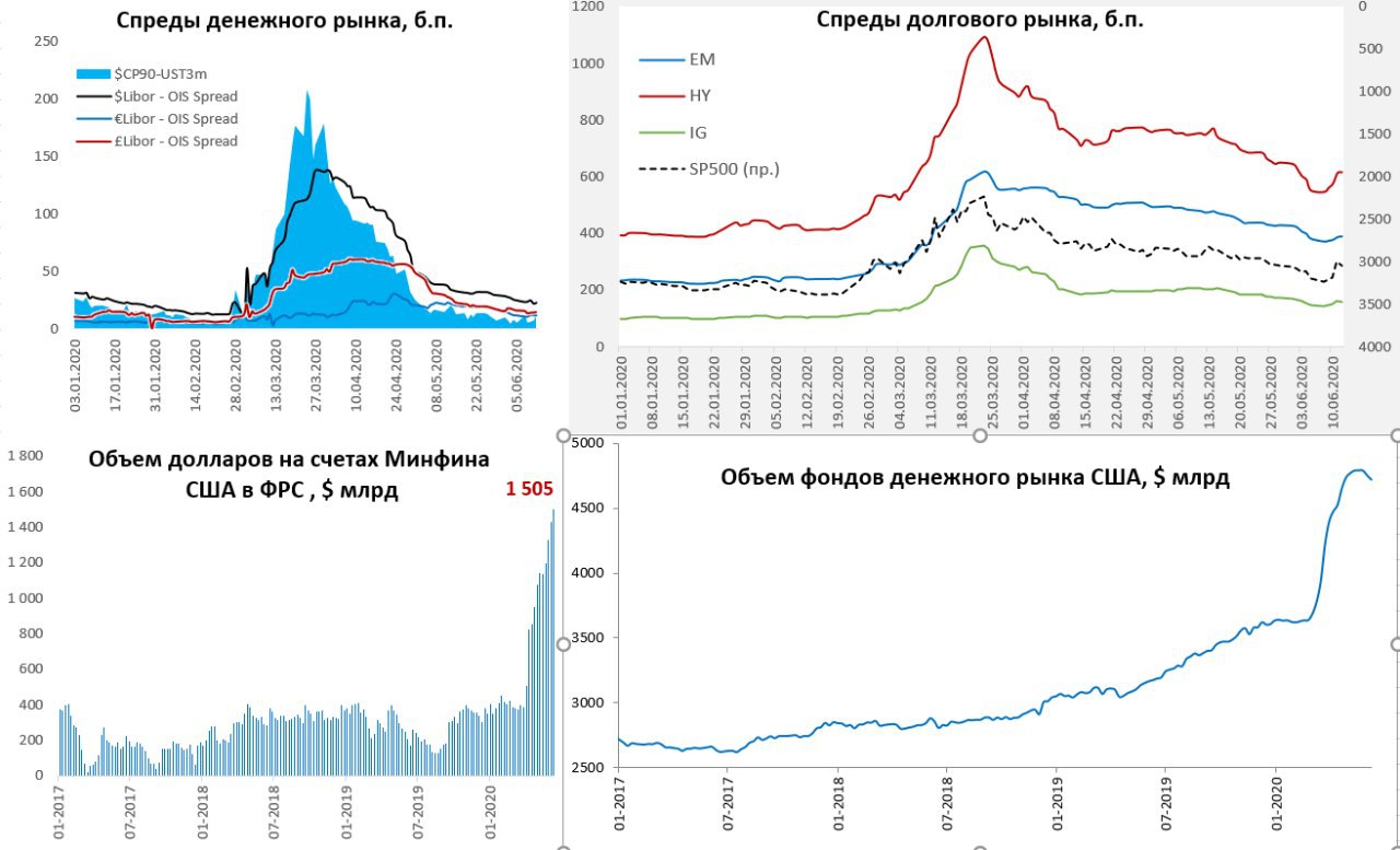 Баланс ФРС за неделю до 10 июня вырос всего на $4 млрд до $7169 млрд, но рынку это не мешало добраться до новых максимумов, прежде чем упасть в четверг. Ликвидность сокращается уже три недели подряд, потому как Минфин США активно складирует средства на счетах в ФРС, за последнюю неделю они сложили на счета еще $73 млрд, а их депозиты в ФРС превысили $1.5 трлн. Происходит это по той причине, что тратить пока получается не так быстро, как хотелось бы, в мае дефицит бюджета всего $399 млрд (менее половины из того, что заняли на рынке), по сравнению с обычными майскими дефицитами это всего ~$200 млрд дополнительно – не густо вышло на фоне триллионных планов. Исправно пока тратят в основном на пособия по безработице (более $90 млрд в месяц). Но Казначейство США обещает исправиться и в ближайший месяц потратить триллион… за 10 дней июня пока смогли освоить почти ¼ триллиона – это сильно лучше, чем было в мае, но по-прежнему меньше, чем собирают на рынке.
