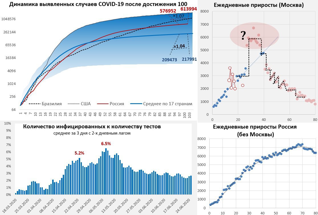 Прирост выявленных случаев COVID-19 в России составил 6800 случаев за день, выдав новые минимумы с конца апреля. Общее количество случаев составило 620.8 тыс. В Москве количество новых случаев ниже 1000 и составило 813 человек. По России без Москвы количество новых случаев упало ниже 6 тыс. в день и составило 5987 случаев. Отчасти это может быть связано с сокращением тестирования, но видно будет все это позже.