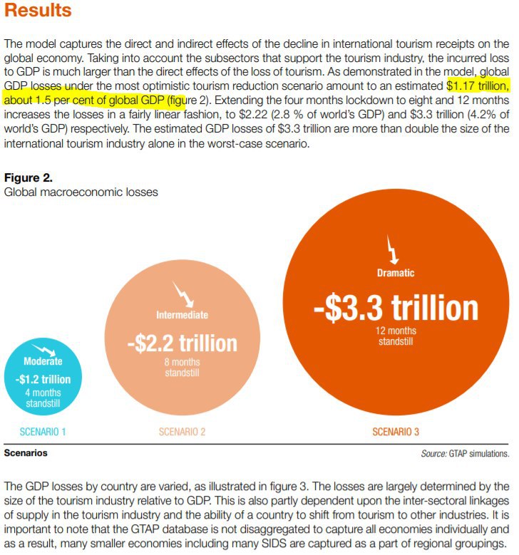 По оценке ООН мировая туристическая отрасль в результате текущего кризиса понесет прямые потери от $1.2 до $3.3 трлн (1.5-4% мирового ВВП) в зависимости от того, когда начнется открытие границ и поездок. Потери рабочих мест в мире оцениваются в 100-120 млн. На самом деле потери, вероятно, будут шире и их шлейф растянется на годы, пока разговор скорее о прямых текущих потерях. Для туристических регионов текущий кризис – это цунами, дефолты и бедность…