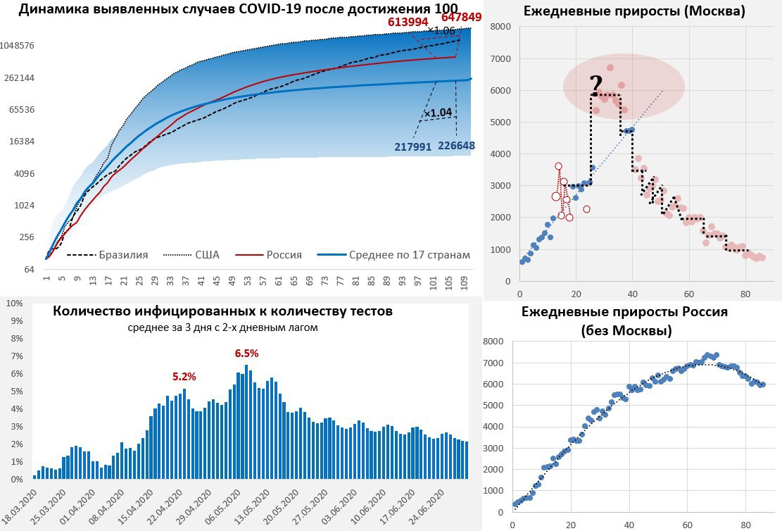 Прирост выявленных случаев COVID-19 в России составил 6368 за день, до минимального уровня с конца апреля. Общее количество случаев составило 694.2 тыс. В Москве количество новых случаев составило до 629 человек. По России без Москвы количество новых случаев упало до 5.7 тыс. Правда одновременно с этим всем резко упали объемы тестирования (минимумы с середины мая) и продолжает расти смертность (максимумы с середины июня). Несмотря на снижение количества выявленных случаев тенденции не очень радуют.