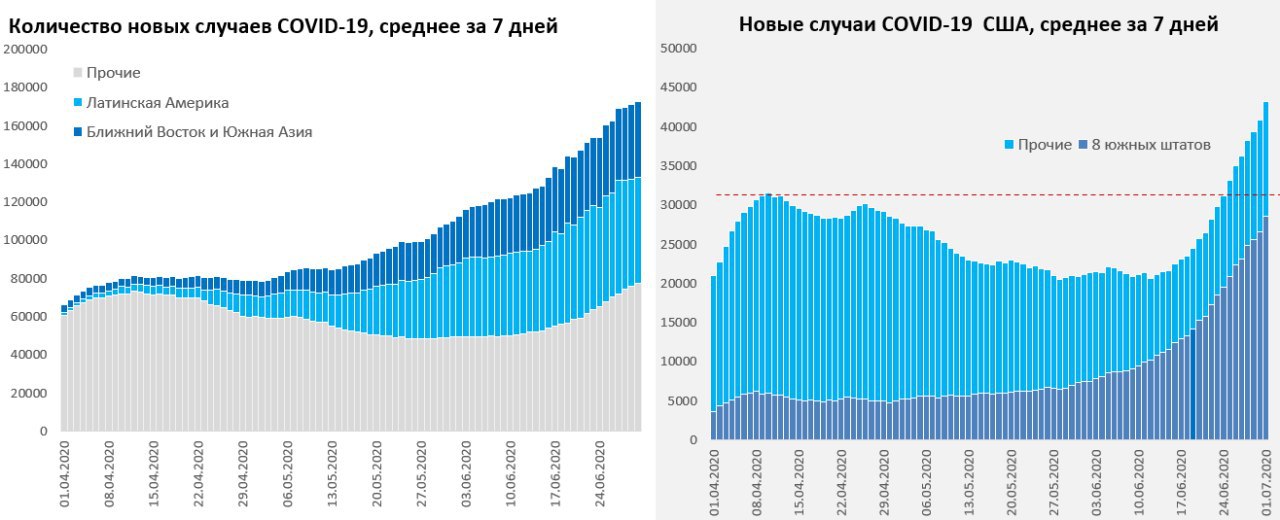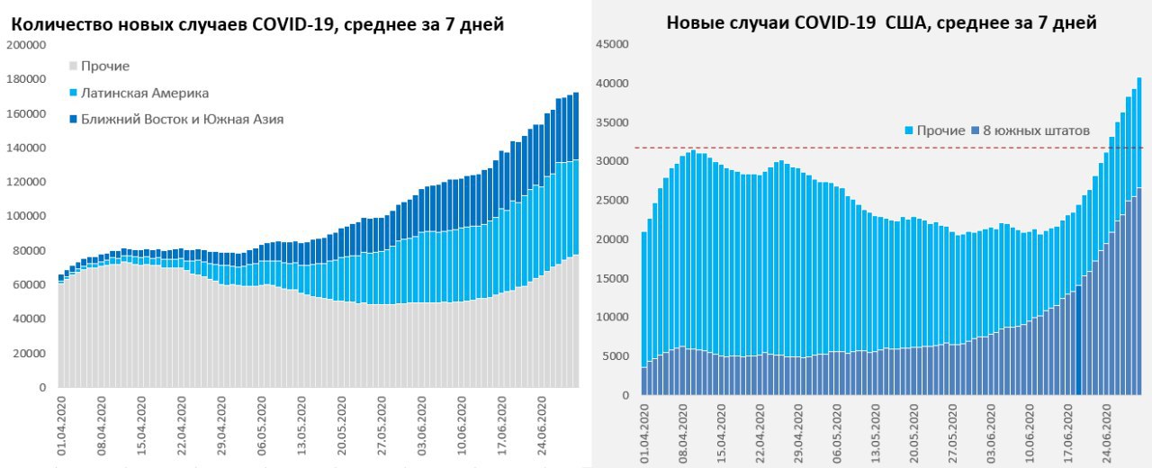В мире ситуация остается негативной, среднее за 7 дней количество новых случаев держится около 180 тыс. США является основным источником прироста новых случаев, их среднее за 7 дней количество новых случаев уже выше 45 тыс. в день (неделю назад было 33 тыс.), а последние два дня держится выше 50 тыс. в день. Количество госпитализированных в США тоже растет, но пока до рекордов далеко. Главной проблемой остаются южные штаты США, где продолжается экспоненциальный рост.