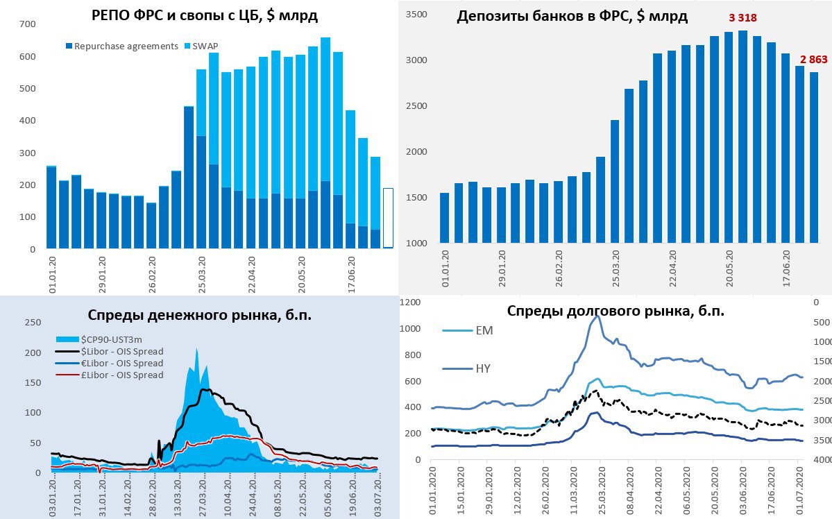 Баланс ФРС продолжает дрейфовать вниз и к 1 июля составил $7009 млрд, сократившись до $73 млрд. Гособлигации исправно покупали на $16 млрд за неделю. Ожидаемо сократилось предоставление долларов иностранным ЦБ через свопы на $49 млрд и РЕПО на $9 млрд, но дополнительно к этому сократились сократился ипотечный портфель на $32 млрд, что скорее связано с упаковкой/переупаковкой этой части баланса.