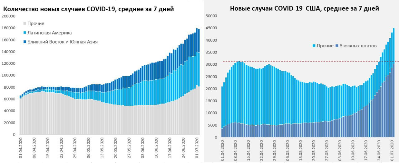В мире процесс развивается в негативном направлении, среднее за 7 дней количество новых случаев превысило около 197 тыс. в день. Америка продолжает набирать обороты, впервые за все время прирост новых случаев за день в США оказался выше 60 тыс., в среднем за 7 дней ежедневно выявлялось 52 тыс. новых случаев в день. Ускоряется рост количества госпитализированных в США, их уже 43 тыс. (на минимумах было 28 тыс.), хотя до пиковой нагрузки все еще далеко (на максимумах было 60 тыс.). Южные штаты США сохраняют темп и генерируют уже 35 тыс. новых случаев в день.