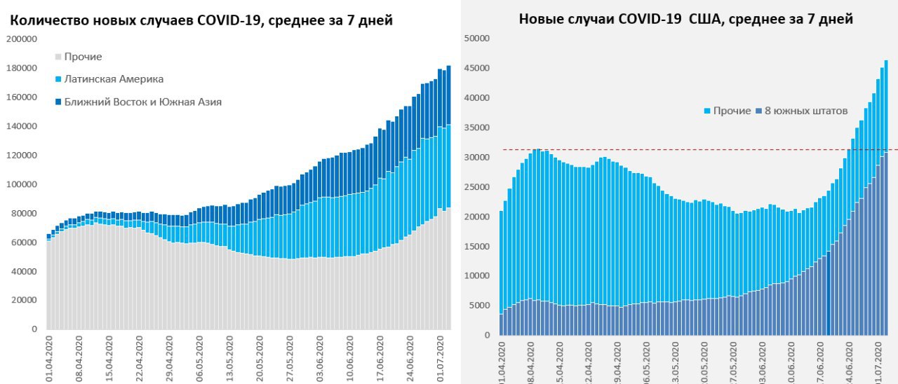 В мире процесс развивается в прежнем ключе, среднее за 7 дней количество новых случаев превысило 190 тыс. в день. Америка остается основным источником прироста новых случаев, среднее за 7 дней количество новых случаев в США превысило 51 тыс. в день. Ускоряется рост количества госпитализированных в США. Южные штаты США сохраняют темп. Активность перемещений и посещений заведений торговли в США начинает снова сокращаться, что будет вести к ухудшению экономических показателей.