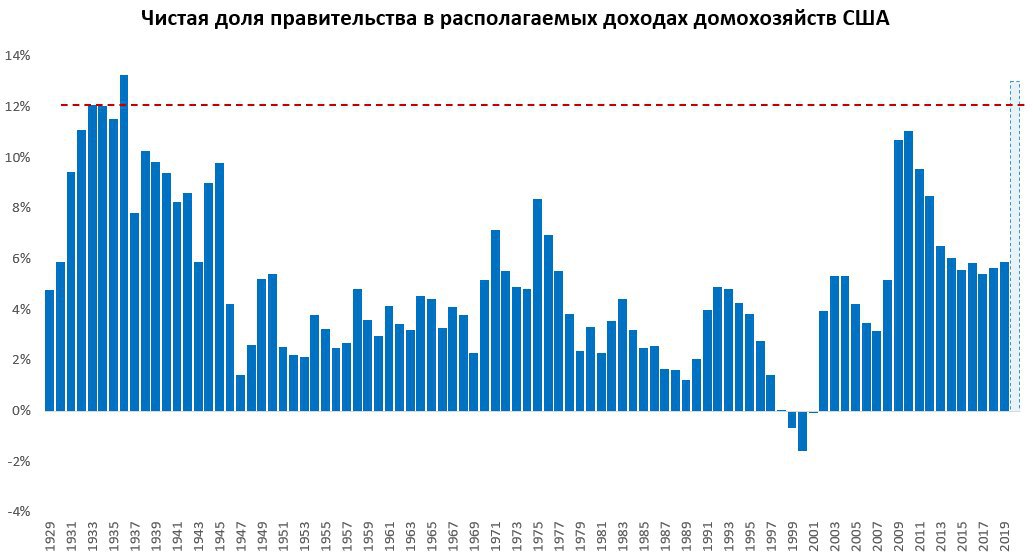 P.S.: В этом году социальный трансферт достигнет 12-13% от располагаемых доходов в США, что сопоставимо с уровнями после Великой депрессии.
