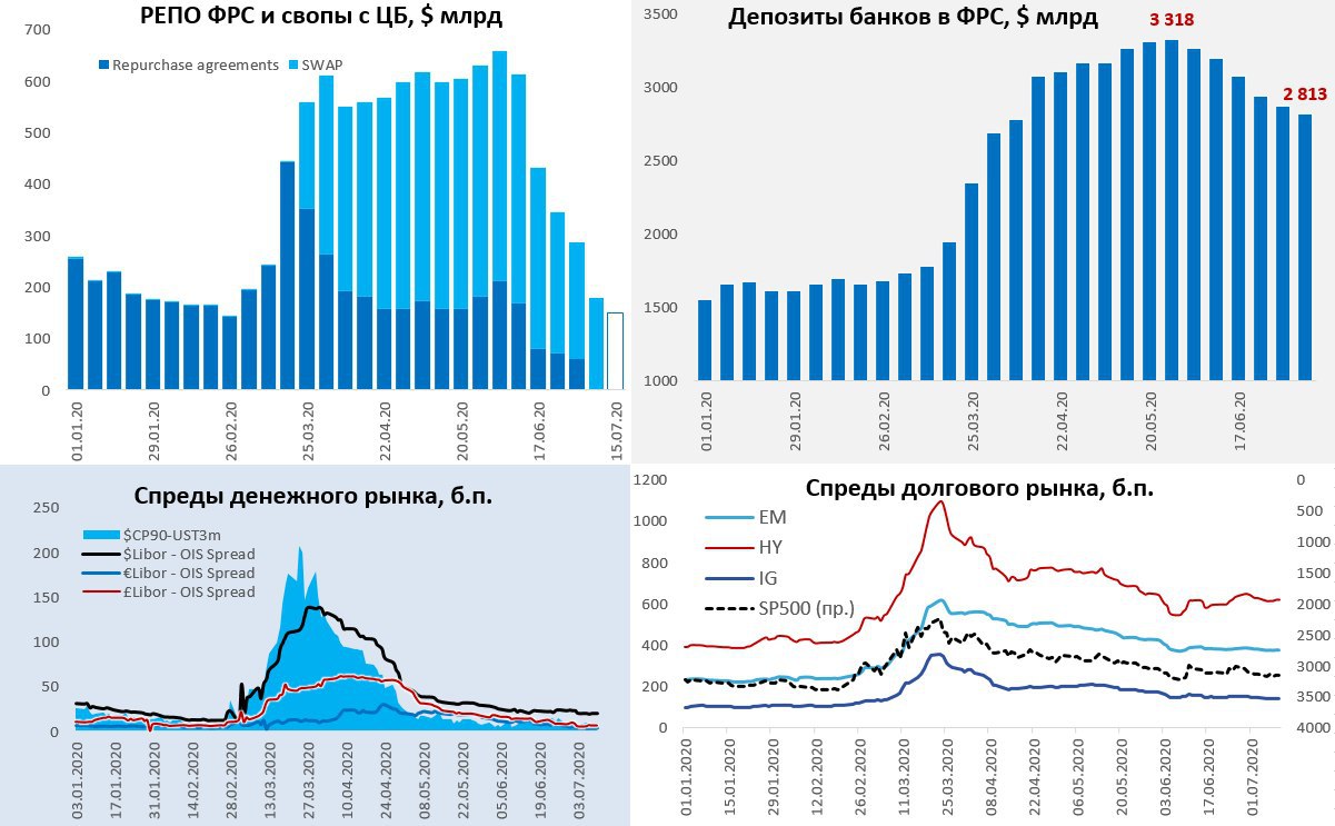 В целом свопы с ЦБ продолжают сокращаться, РЕПО все закрыты, ФРС продолжает скупать госбонды, а Минфин США начал постепенно тратить, потому какого-то сильного негатива с этой стороны не проглядывается, ждем стабилизации баланса ФРС и постепенного возвращения к росту за счет покупок бумаг ближе к августу.