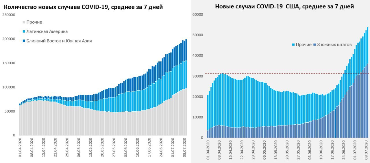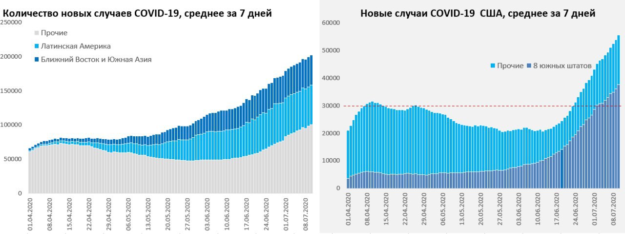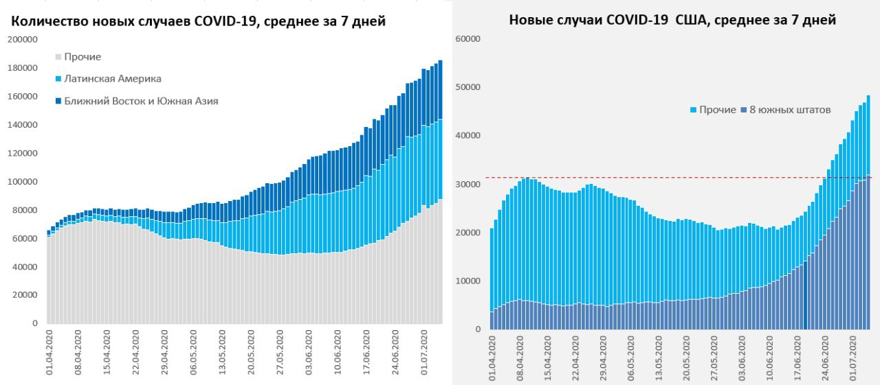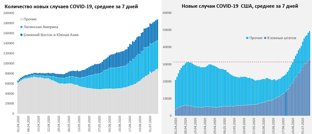В мире процесс развивается в негативном направлении, среднее за 7 дней количество новых случаев превысило около 197 тыс. в день. Америка продолжает набирать обороты, впервые за все время прирост новых случаев за день в США оказался выше 60 тыс., в среднем за 7 дней ежедневно выявлялось 52 тыс. новых случаев в день. Ускоряется рост количества госпитализированных в США, их уже 43 тыс. (на минимумах было 28 тыс.), хотя до пиковой нагрузки все еще далеко (на максимумах было 60 тыс.). Южные штаты США сохраняют темп и генерируют уже 35 тыс. новых случаев в день.