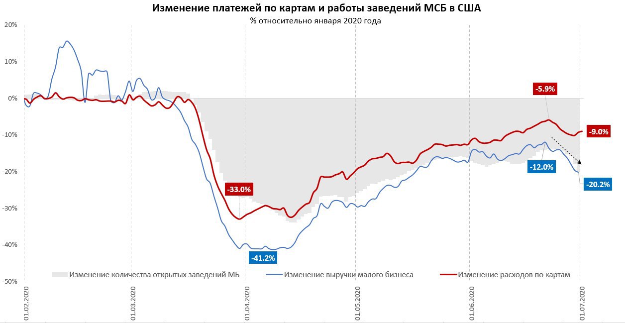 Безусловно пользоваться сейчас официальной статистикой сложно, она запаздывает и будет сильно пересматриваться. Потому продолжаем смотреть на более альтернативные данные (благо их все больше). В третьей декаде июля торговые точки и заведения отдыха и другие заведения малого бизнеса снова стали закрываться в США. В итоге к началу июля было открыто на 20% меньше заведений, чем в начале года, что на 6-7 п.п. меньше, чем в середине месяца. Аналогичную динамику демонстрируют и доходы МСБ – они на 20% ниже январских уровней, что является худшими значениями с середины мая и на 8 п.п. ниже уровней, достигнутых во второй декаде июня.